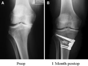 Osteotomy. In a knee osteotomy, either the tibia (shinbone) or femur (thighbone) is cut and then reshaped to relieve pressure on the knee joint. Knee osteotomy is used when you have early-stage osteoarthritis that has damaged just one side of the knee joint. By shifting your weight off the damaged side of the joint, an osteotomy can relieve pain and significantly improve function in your arthritic knee